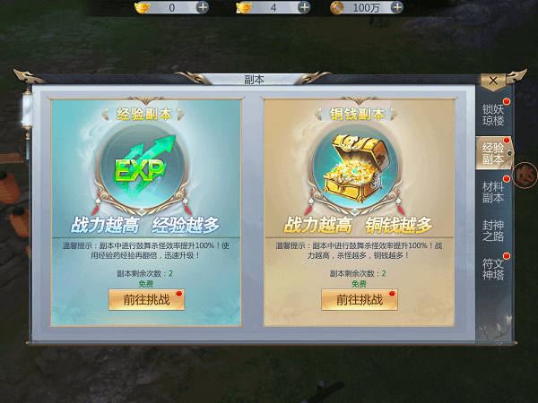 在经验副本中有四个副本可供选择,分别为经验副本和铜钱副本。想好自己所需的奖励,只要选择相应的副本进入便可以。在副本场景中,在限定的时间内击倒一定数量的敌人,便可以获得不同的奖励。